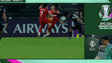 看到主裁判出示红牌,阮庭北跪倒在地。这一幕也让越南主帅看傻了眼,随后向主裁判做出两名球员各有50%触球机会的动作。